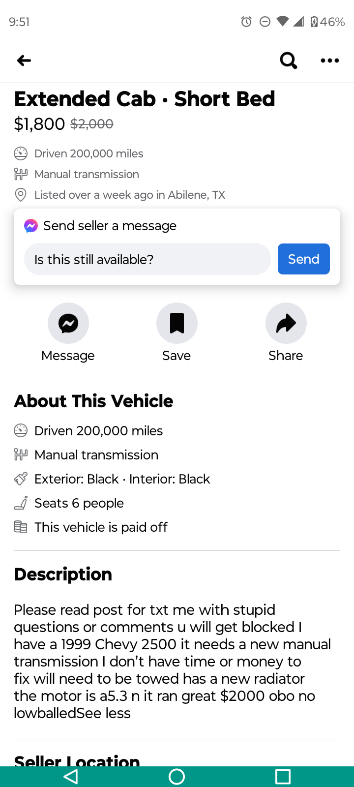 I don't know if any part of it was stolen, But I was going to take a chance or be part of it. It was clear that some one swapped the 2000 1500 body onto the 03 Chassis. Maybe they just took 2 wrecked trucks and made one. But no one disclosed that to him and He wasn't going to be able to register any where they require a smog check because once the plug in and see the vin doesn't match it will fail automatically. And if the vin in the ECU is attached to something reported stolen, Game over....they will seize the truck and he will be out the money on it.