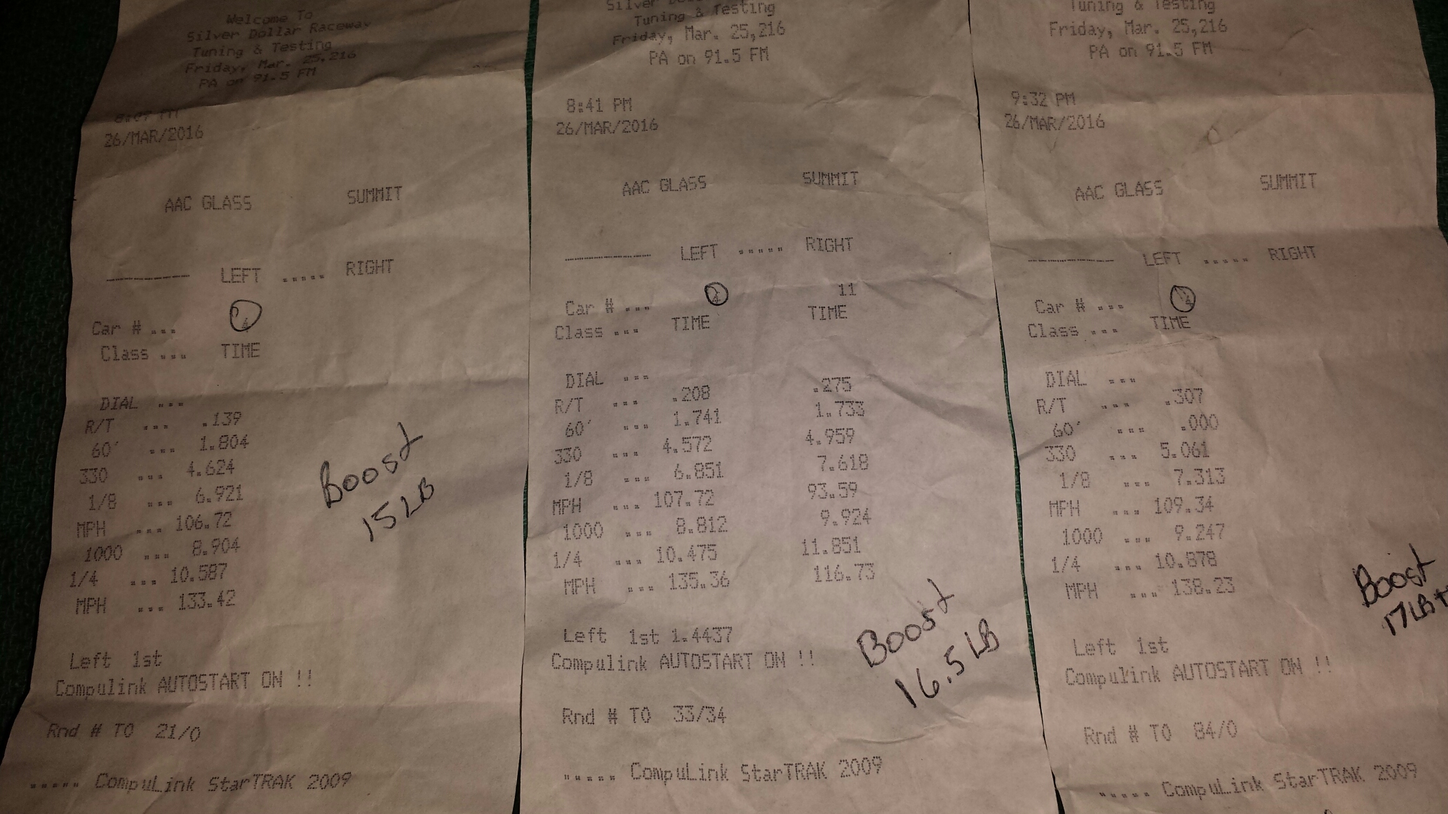 Hope to have a few more weekends of cool and dry weather before it gets hot. I really wanted to try out the slicks, race gas and more boost. One thing is the new shocks are working out good. With the double adjustments I've got the MT radial working good. 1.67 slicks vs 1.74 radial. But I'm having fun and that okay be me.