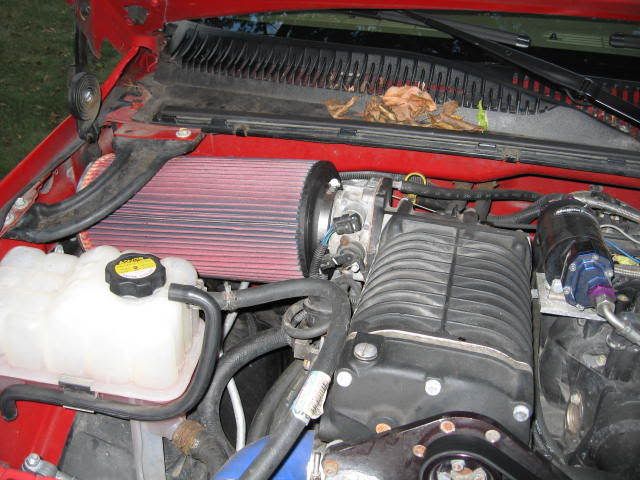 I got one of the biggest K&Ns that I thought would fit, and it was too long. My idea was to eliminate the restriction from the Whipple air tube and stock air box. I overestimated the room I had, and had to cut about 4" off of the filter. I then cleaned it with brake cleaner, and glued the end cap back on with polyurethane. You can see the yellowish mess on the end in the pic. You would think that it is loud when you look at the pic, and you would be right. At cruise, there is only a little hiss. But get into the throttle deep, and somebody sets off the air raid siren. How does it run? Drum roll please... Like crap! Before I logged, I was thinking, "man this is way lean. It freed up so much air flow, that when I retune, I'll double the power." After logging, the culprit turned out to be high IAT. On a 90° day, I was cruising at 117°. That's a good 15° higher than with the stock air box. So I get to kill 2 birds with one stone next: I'll have to build an enclosure that will pick up cool air from somewhere, and it will help quite it down.