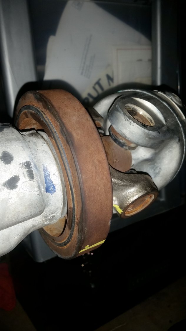 Yeah that is jammed up against and inside the seal, holy ****!!! If you have a long punch or chisel, or even a fairly large screwdriver you dont care much about put it againts the closest part of the yoke you can to the tailshaft housing and take the biggest hammer you have and knock the crap out of it...