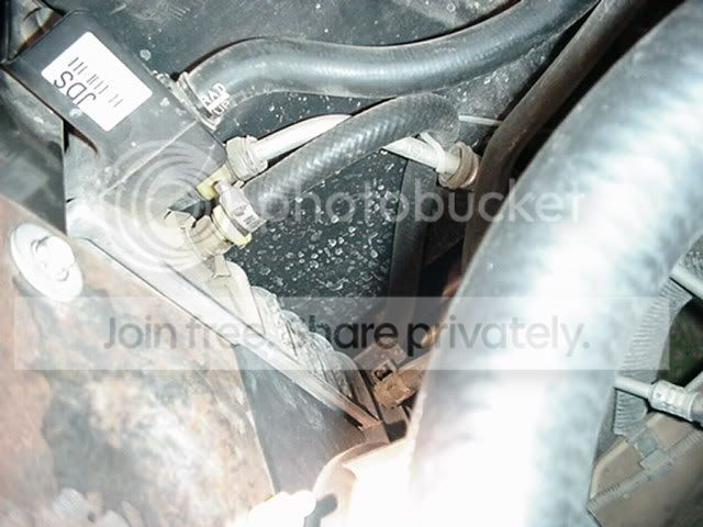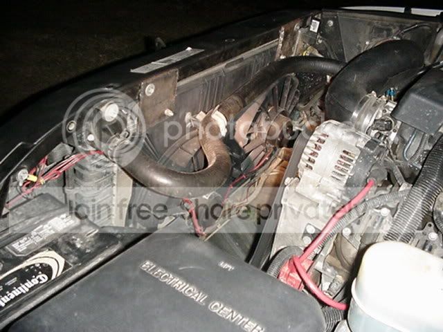Here is a accidental picture of the passenger side one.. i just cut some 1/8" metal and put a slight bend at the top 3/4" of it so it actually presses the E-Fans up against the radiator, i put some thick weatherstripping behind mine to keep from rubbing the radiator..