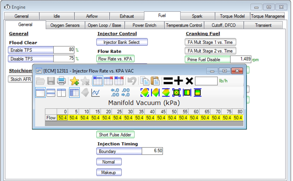 This is the injector flow rate table with the same flex injectors running the Corvette (non vacuum) regulator. You can see how the tune itself manages the flow rate vs the old gen3 vacuum referenced regulator.