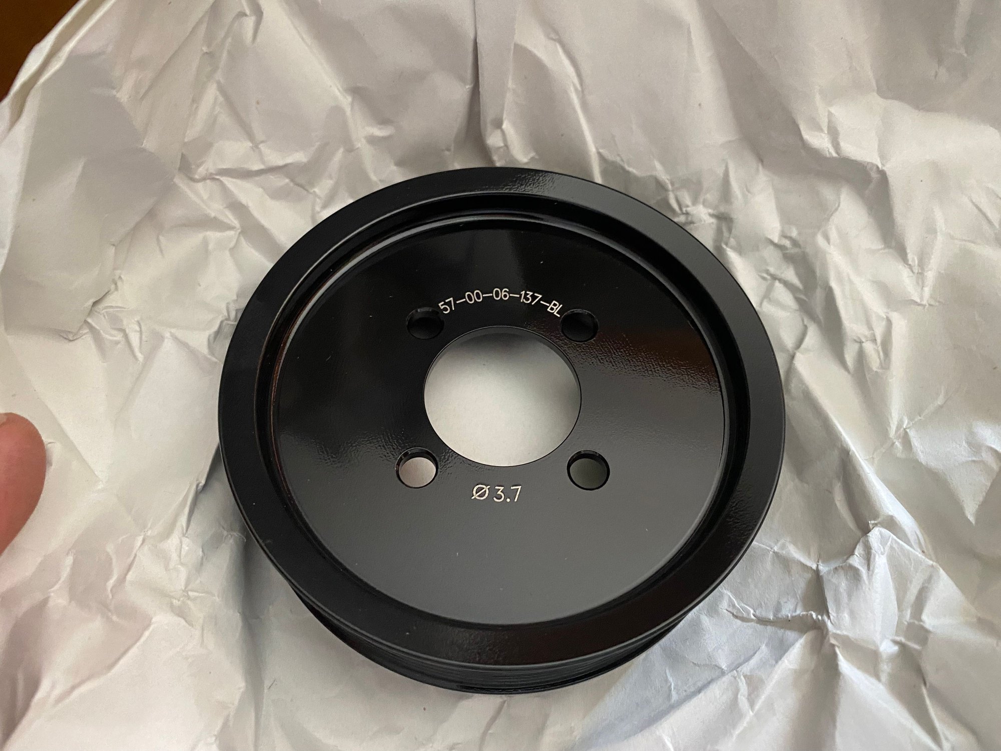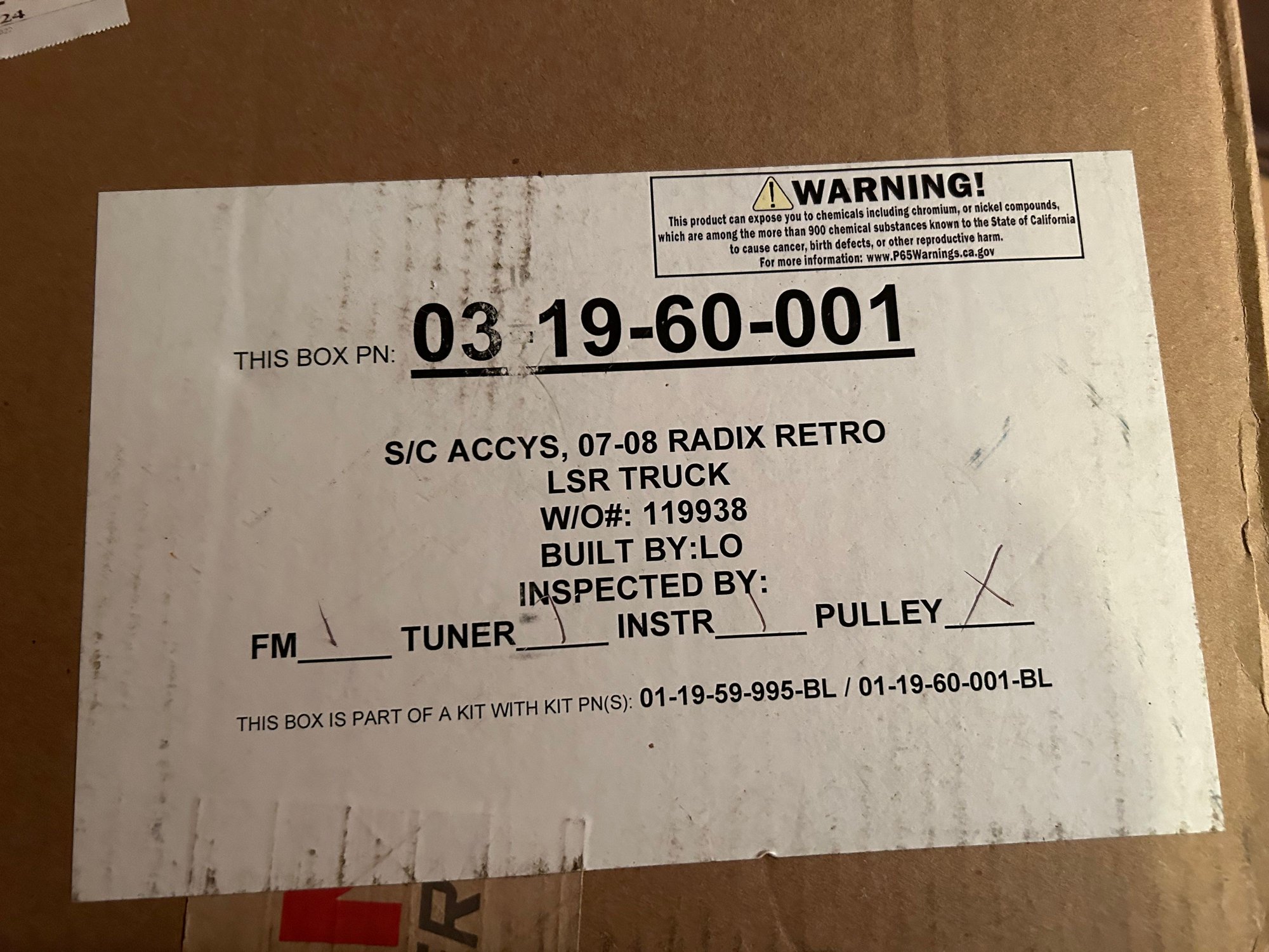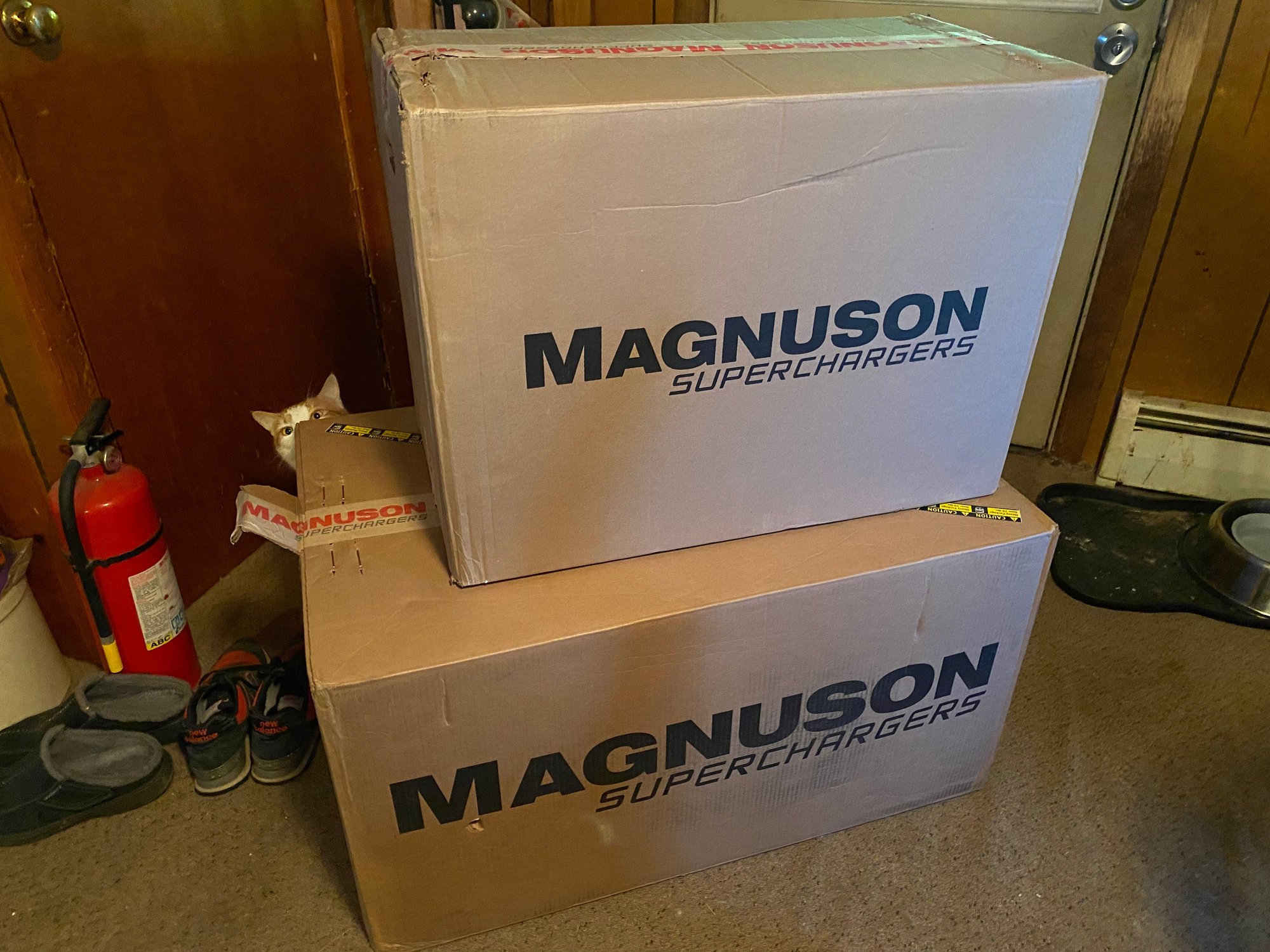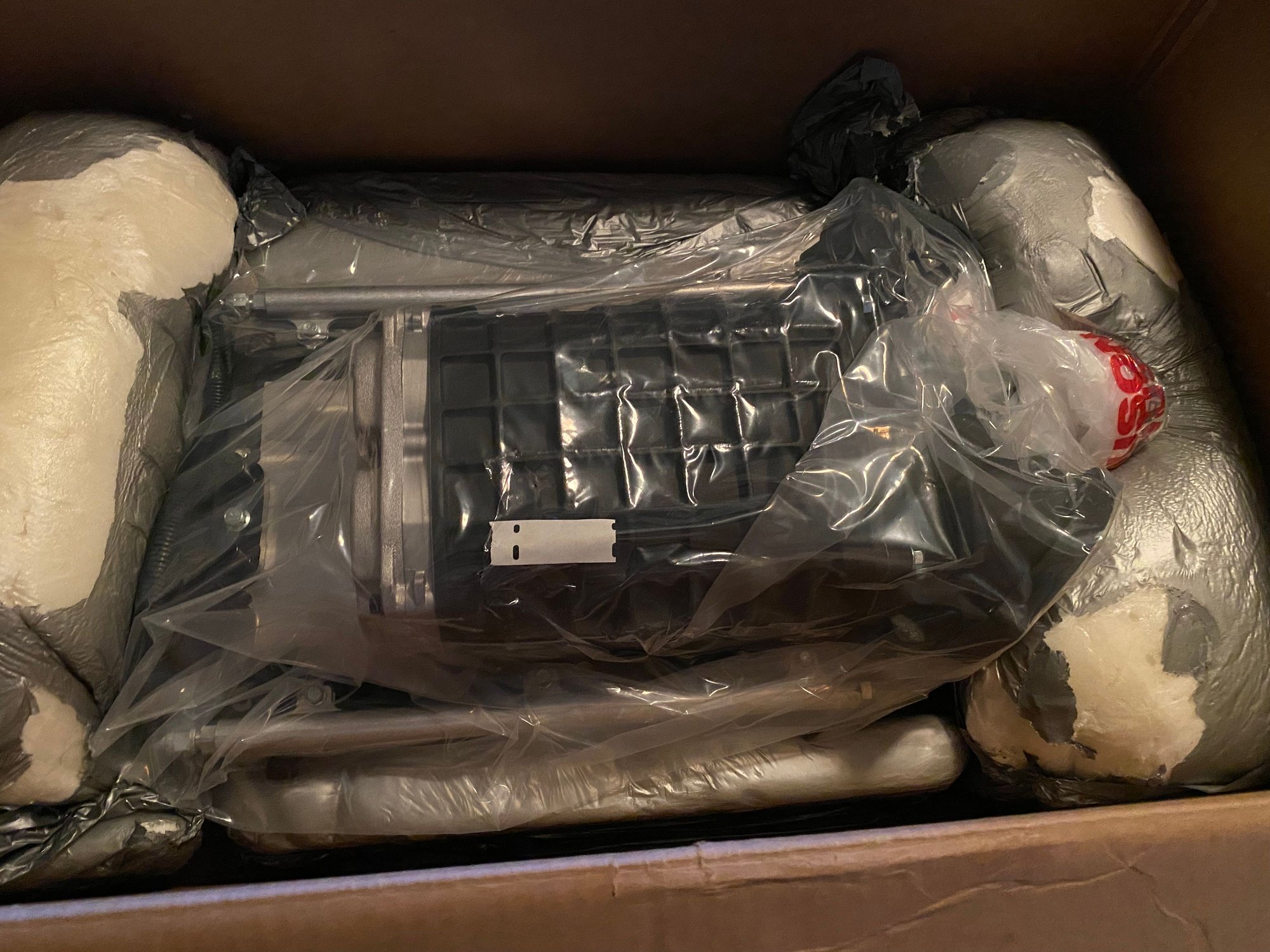 Brand new, in box. Only opened the box to check contents. Never even lifted the supercharger, or ANY of the other parts out of either box. The pulley came separately for some reason. Straight from Magnuson, ordered through Summit Racing.