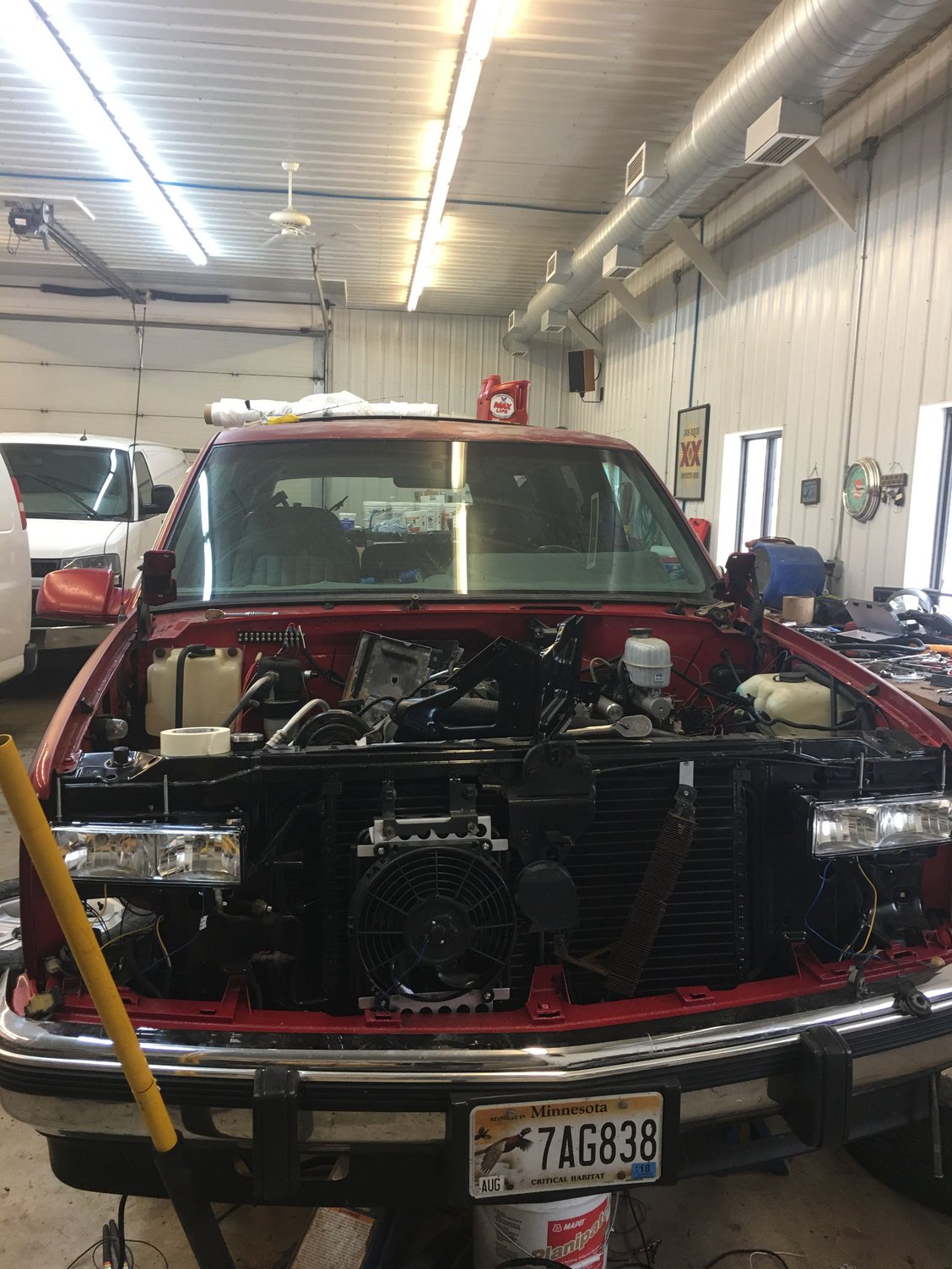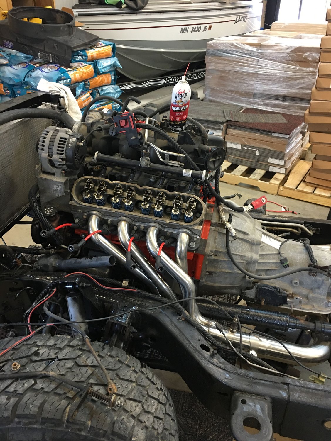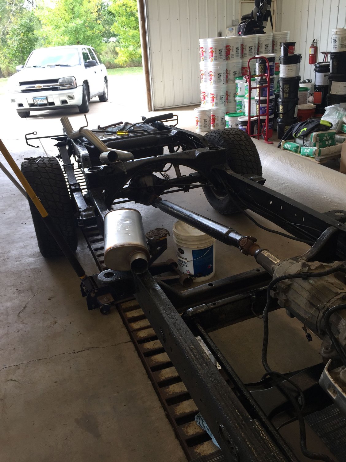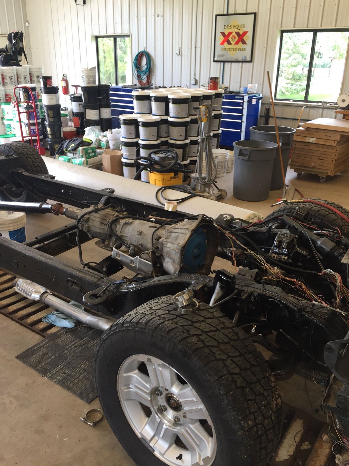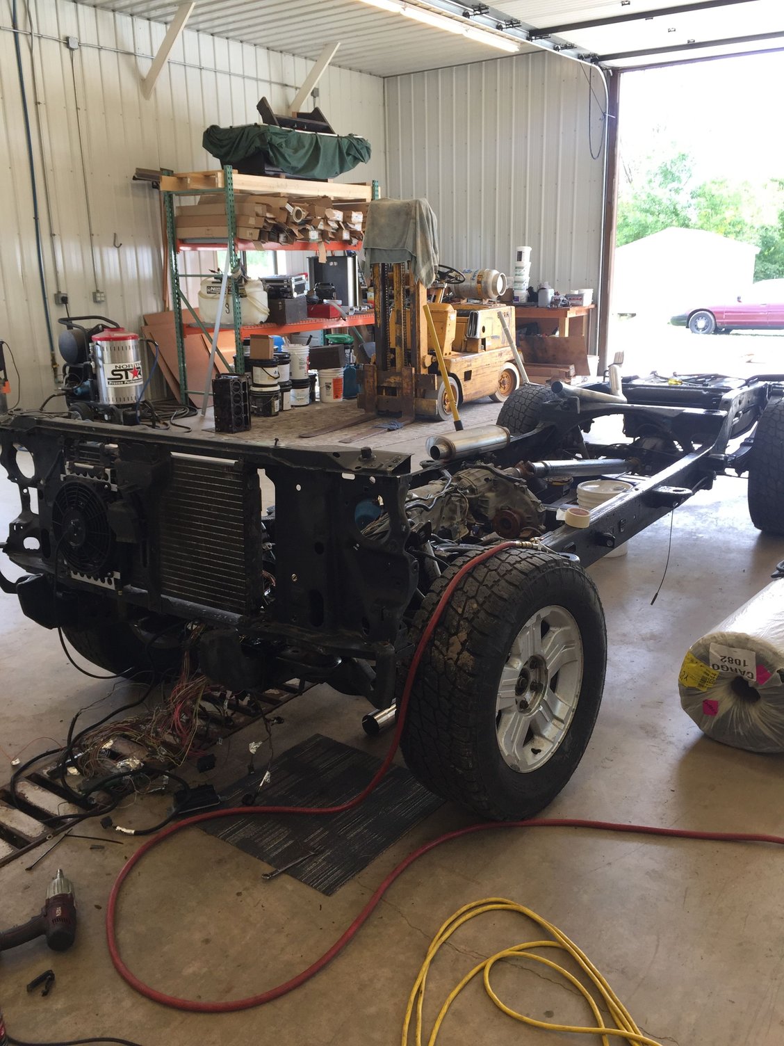 This was my last suv project. 6.0 swapped suburban. Built the motor from a bare block I got for dirt cheap. All new everything on the chassis and reworked 90% of the trucking wiring. Frame and body separated. Fixed some rust on the body Blasted and por-15 on the frame Installing radiator and exhaust 6.0l in