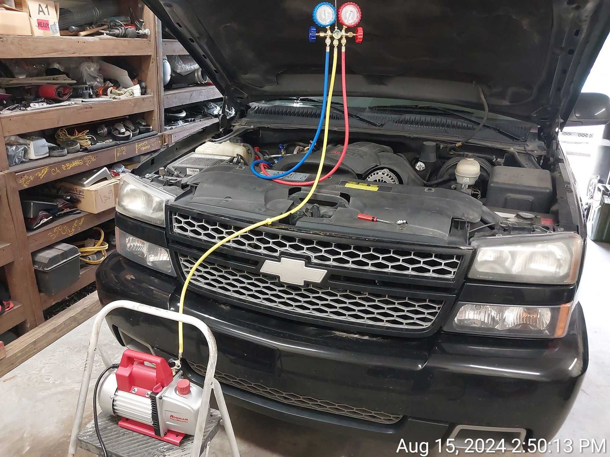 I probably hadn't done any A/C work since before R134a became standard. Took me a couple false starts and minor screw-ups but I got it together pretty quick. I re-built the A/C in my '93 C3500 and used all '94 spec parts so it was R134a-ready without using conversion fittings, plus everything was in crummy condition with a busted compressor, so it got the works. Did that first, then went on to deal with the slightly leaky but still working A/C on the '06.