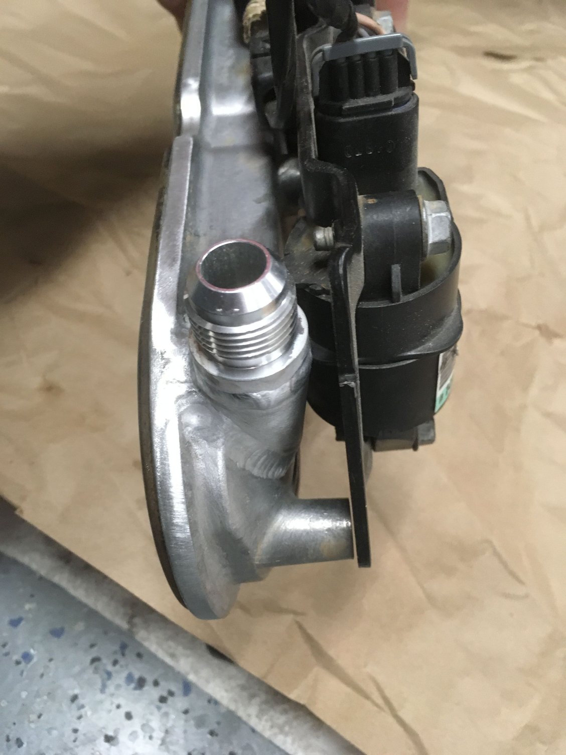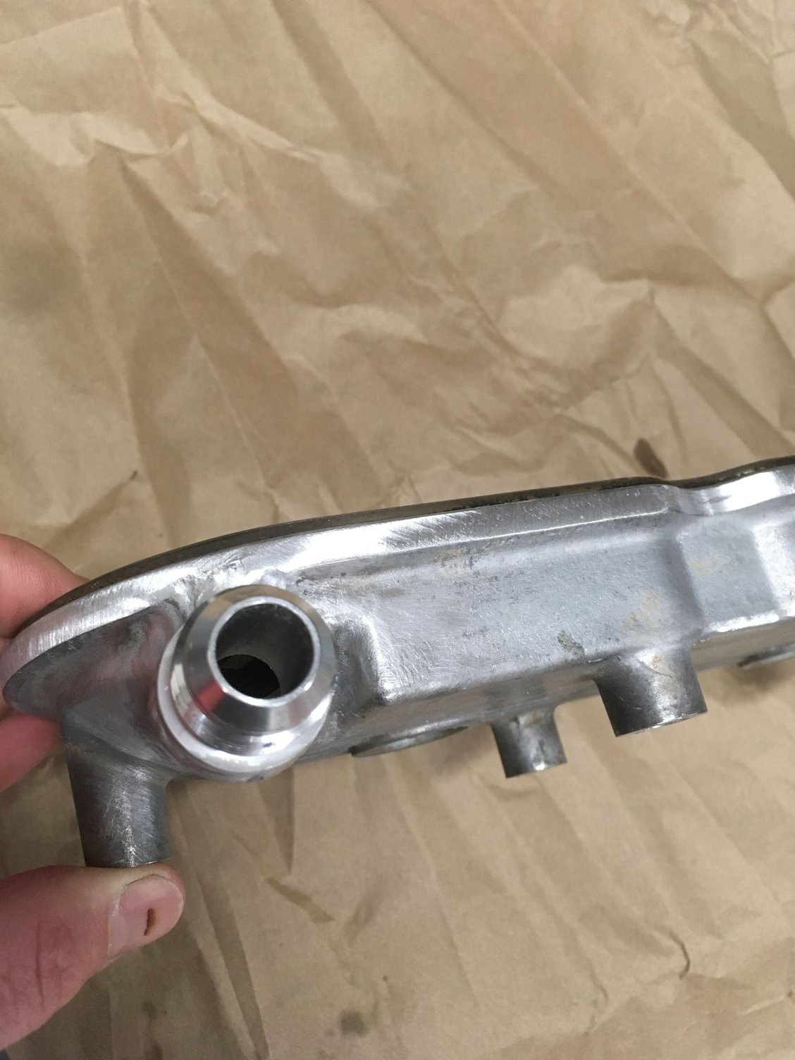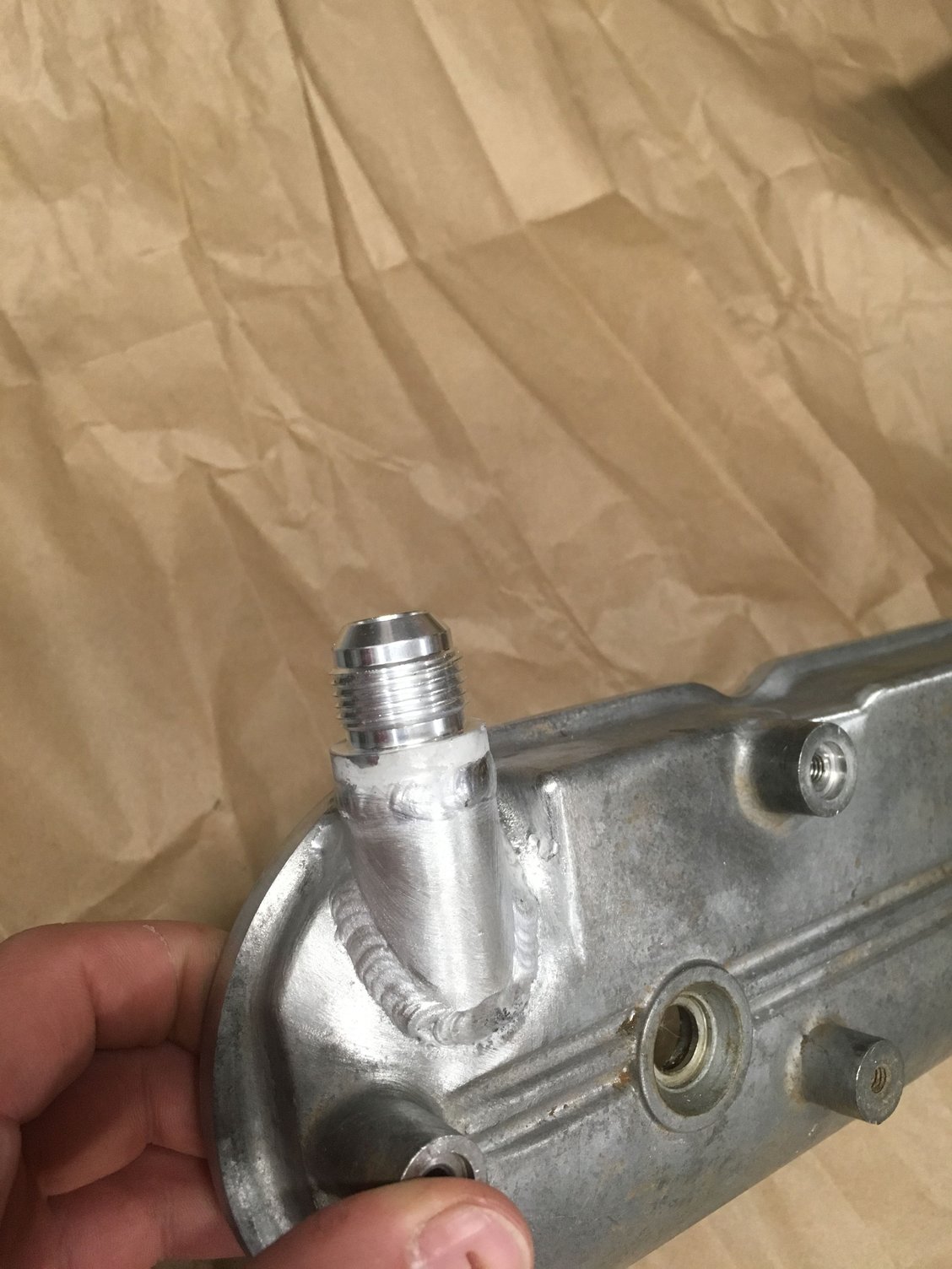 Second pic is a fabrication I did to get a 10AN on the passenger side, back of the VC. It's an aluminum tube, 3/4 OD, 1/2 ID. Drilled the cover, coped the tube, welded to cover and welded bung on. I did a ton of test fits to ensure the coils would still fit