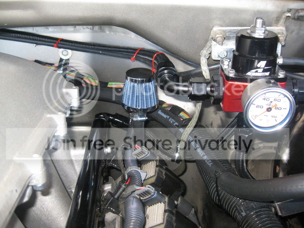 Not sure if its the right way to do it, but my PCV system seems to be working. I made the filter piece seen above between the FPR and Intake. So fresh air enters the crank case on the drivers side, travels through the engine and out the drivers side valve cover. Then the line travels to the inlet of a catch can with the outlet of the catch can going to my intake tube between the TB and MAF/Air Filter. Probably isn't a very strong vacuum but the catch can is trapping oily water.