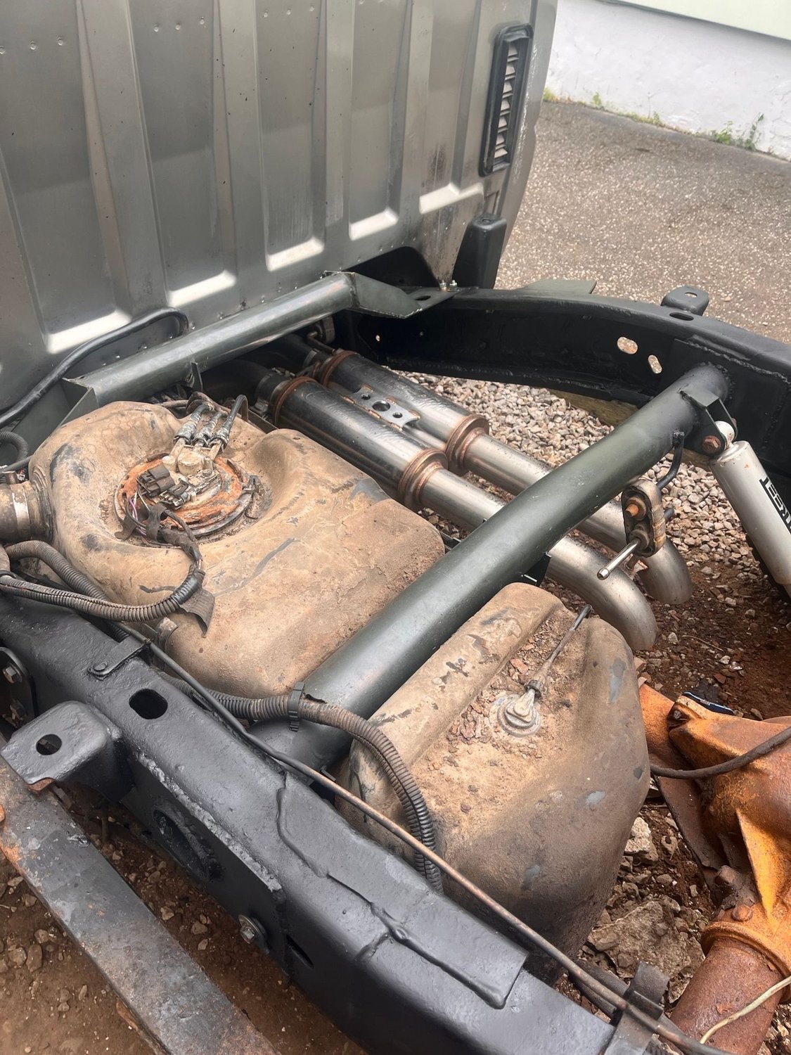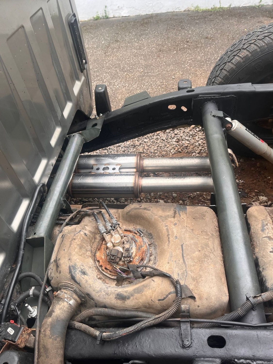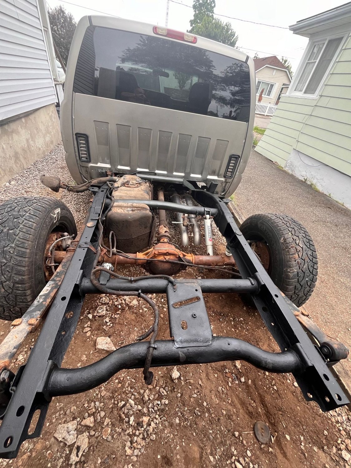 well another weekend down and more work got done on the truck. finished up the rear frame of the truck and got everything put back together. bought these fuel tank support tubes of ebay and honestly better then i thought they would be. everything went back together pretty quick and fairly easy. also finished up the small patch under the front passenger tire, not my best work tbh but the strength is back in the frame just doesnt look the prettiest. also to a picture of the truck and the new stance. the front is still a bit high for my liking might get 2' drop spindles but that will be at a later date.