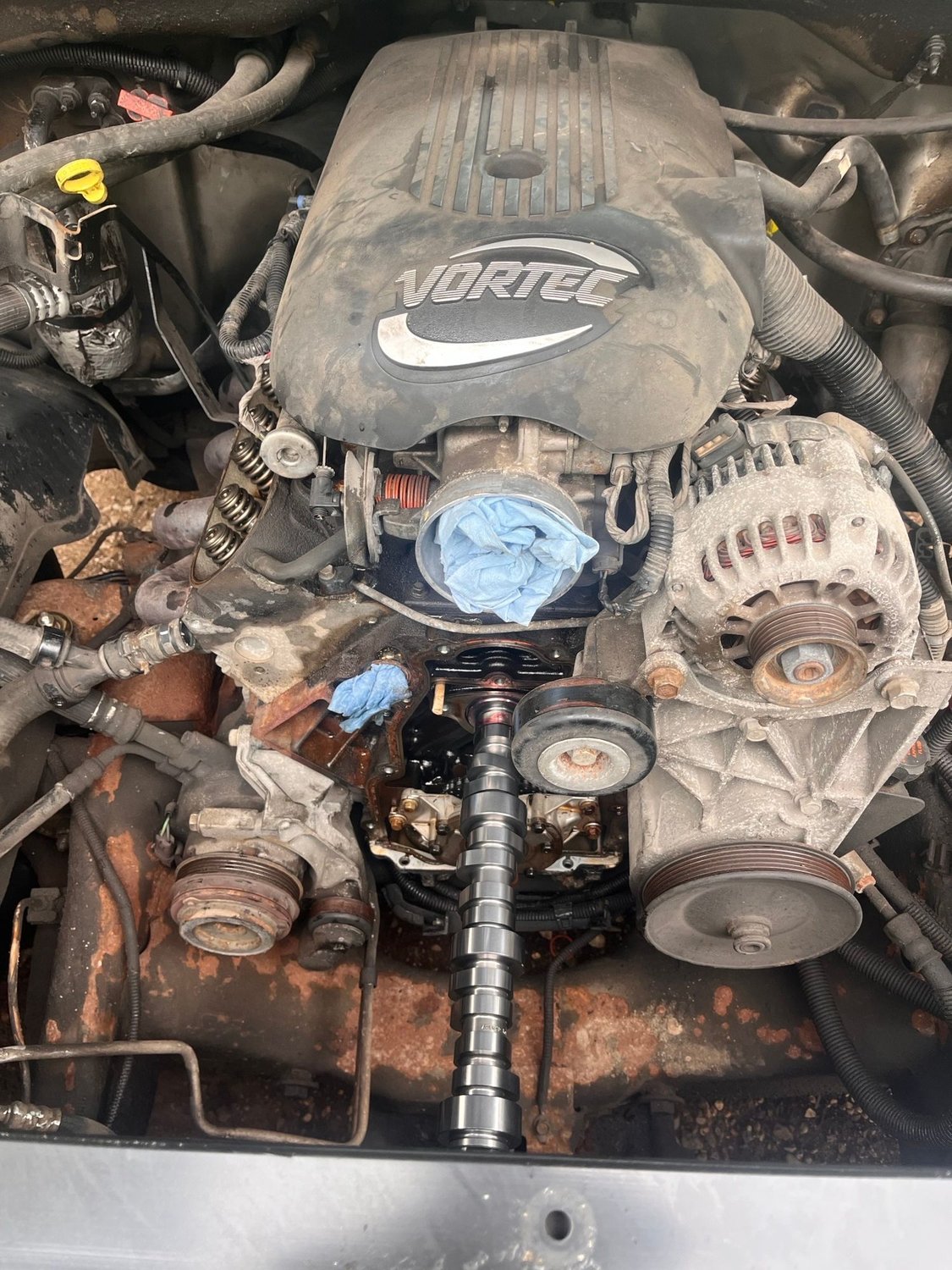 well finally got to installing the fun stuff. put the truck norris NSR cam in and the installed the electric fans. I love working on this truck, everything for the most part is super easy to do when you have the right tools and parts. took me about 4 hours to install the cam and fans. fabricated 4 little brackets to hold the fan in and we are good to go. I installed the tune that I got from Michigan motorsports, its a good enough tune to get me going but there is definitely some fine tuning that needs to be had. I had to re-work the idle a bit and even now its still idling in gear around 1000-1100, not sure if thats normal or not after a cam install(my first cammed motor). i did get a new IAC should be here this week and ill put that in to see if that helps. all things aside this thing sounds amazing! and it definitely has some more power up top. the truck is still a dog off the line with the little 4.8, but install the posi and 4.10 gears in the next coming weeks and that should help. also going to get a higher stall converter as well(2500ish stall) then my little street machine will be all good to go!! then i can get onto the body work this winter.
