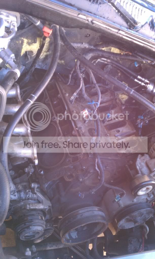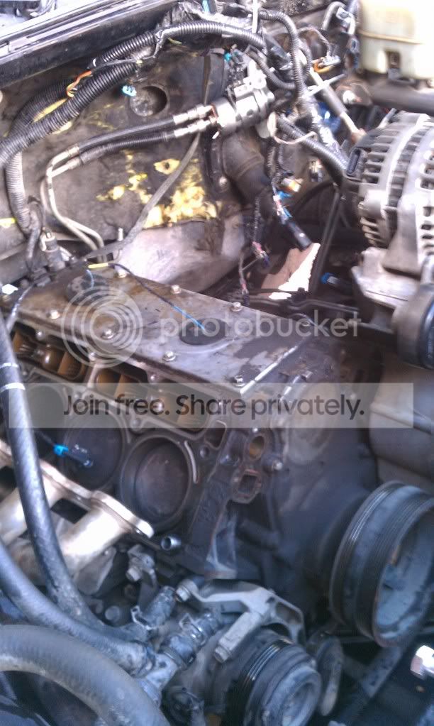 spent about 6 hours working on the truck. Got it most of the way torn down. Had a hell of a time getting the drivers side head off. The head bolts were hitting the header. Had to remove the front driveshaft and drop the header. but it finally went my way. Rented a 3 jaw pulley from auto zone and when I got home the bolt was broken, so I gonna have to get another one.