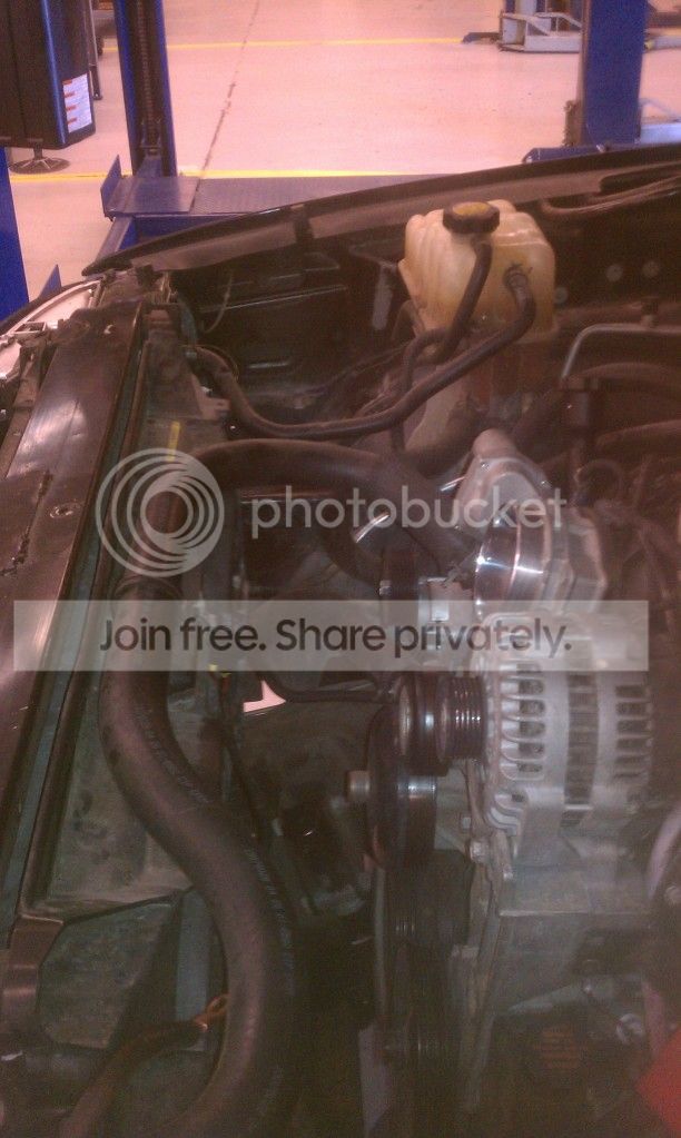 some more pics of the install. since the brackets were for a 05 the porcharger outlet was strait down, This made it hit the alternator bracket. I had to re clock the procharger and grind alittle off the corner of the bracket.