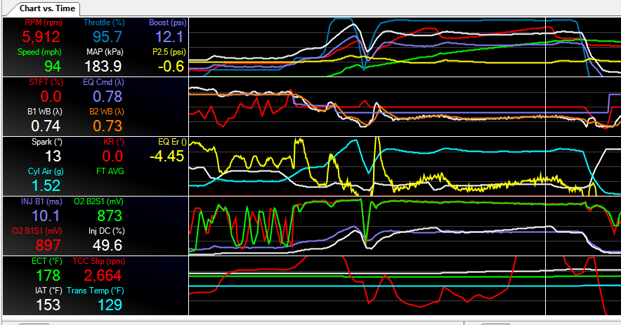 This is a log of the gates wide open. The Yellow line in the top section is the sensor between the turbos and blower, essentially turbo boost. The purple/white line is blower+turbo. Run 4, gates wide open