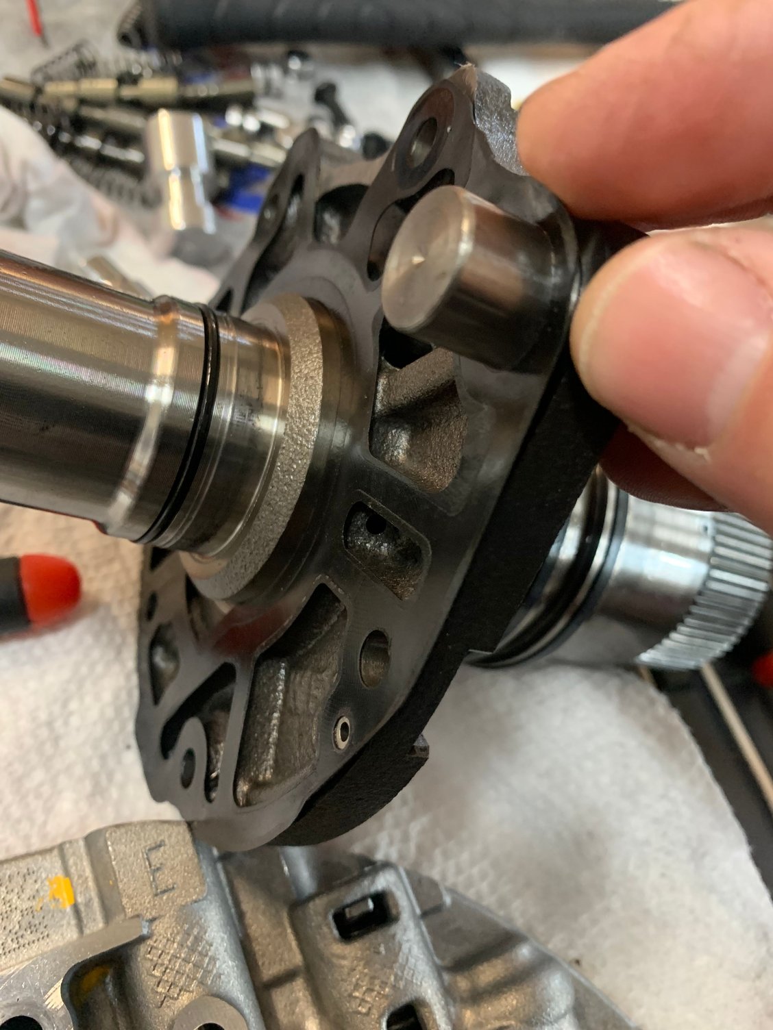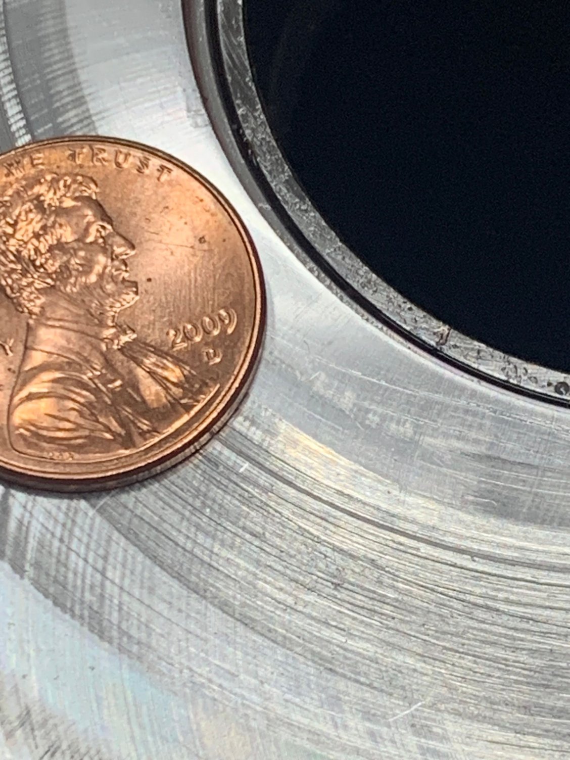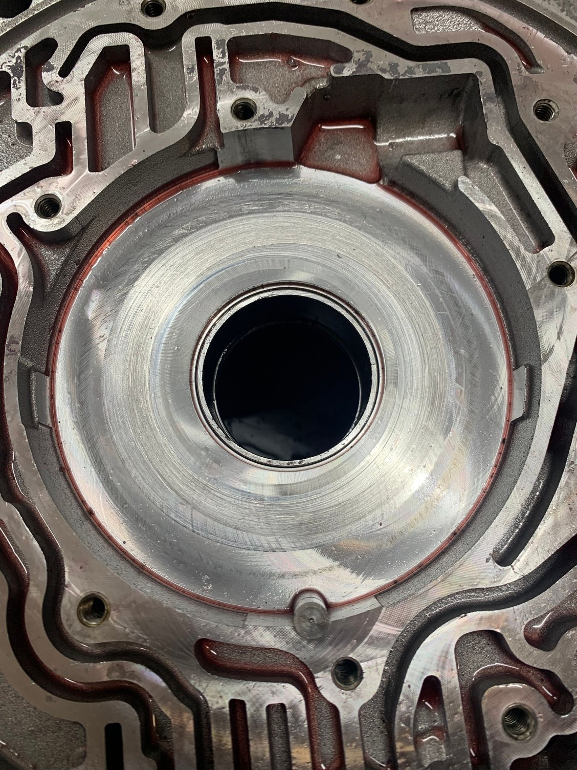 Bellhousing side of pump surface….notice the scuffing that’s already present and the machining marks. The machining marks act as “wipers” which literally squeegees the fluid film away resulting in metal to metal contact. You can catch a fingernail on some of the scuff marks.