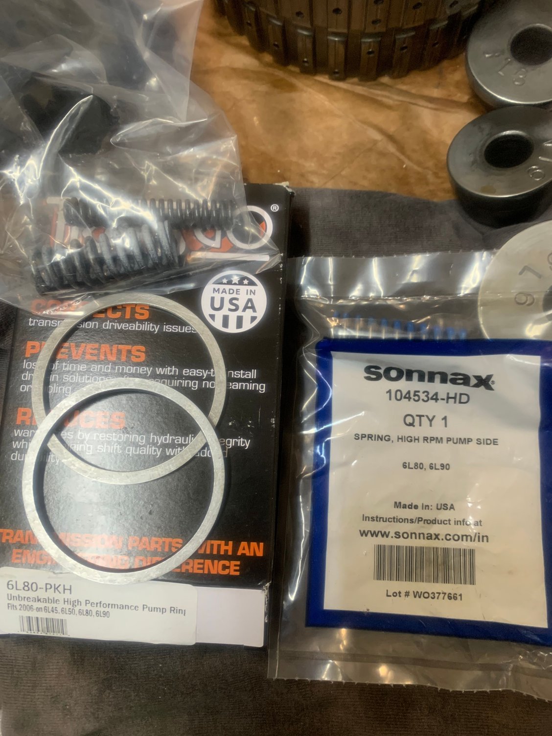 Last bit of little upgrades came in….steel pump rings and stiffer pump slide spring. Only have a few more bushings to beat out so I can install the new bronze ones. El cheapo Amazon clutch compressor actually worked and I got the 1-2-3-4 billet piston installed. I also got most of the way done with installing the mishimoto trans cooler. I didn’t realize the kit still uses the factory cooler inline with the new cooler, so that’s pretty cool. I have to get some more Kooler Kleen flush and I can finish bolting that all together.