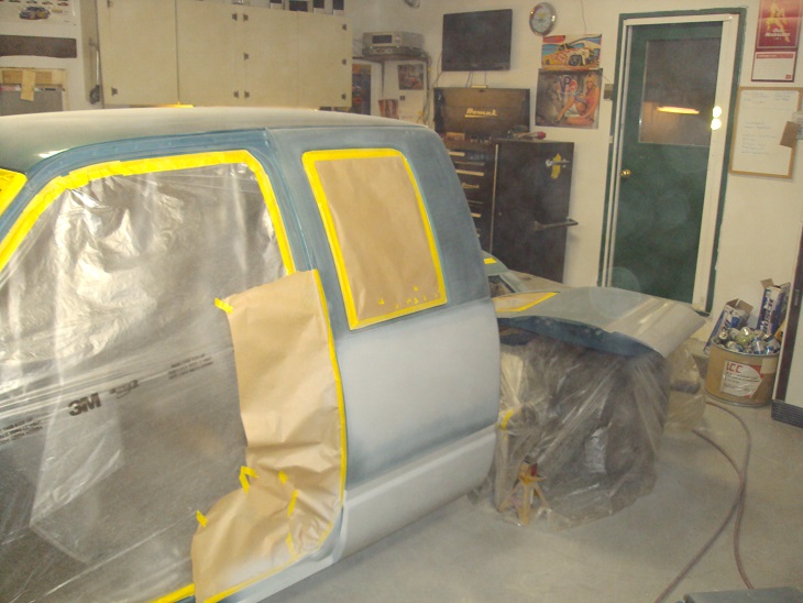 used the cowl hood from the previous truck, had to patch in where it was cut for the clearance for the old 350 with giant intake and carb on it, used one original fender and another gm original fender from another truck scrapped. painted the inner fenders and fenderwells