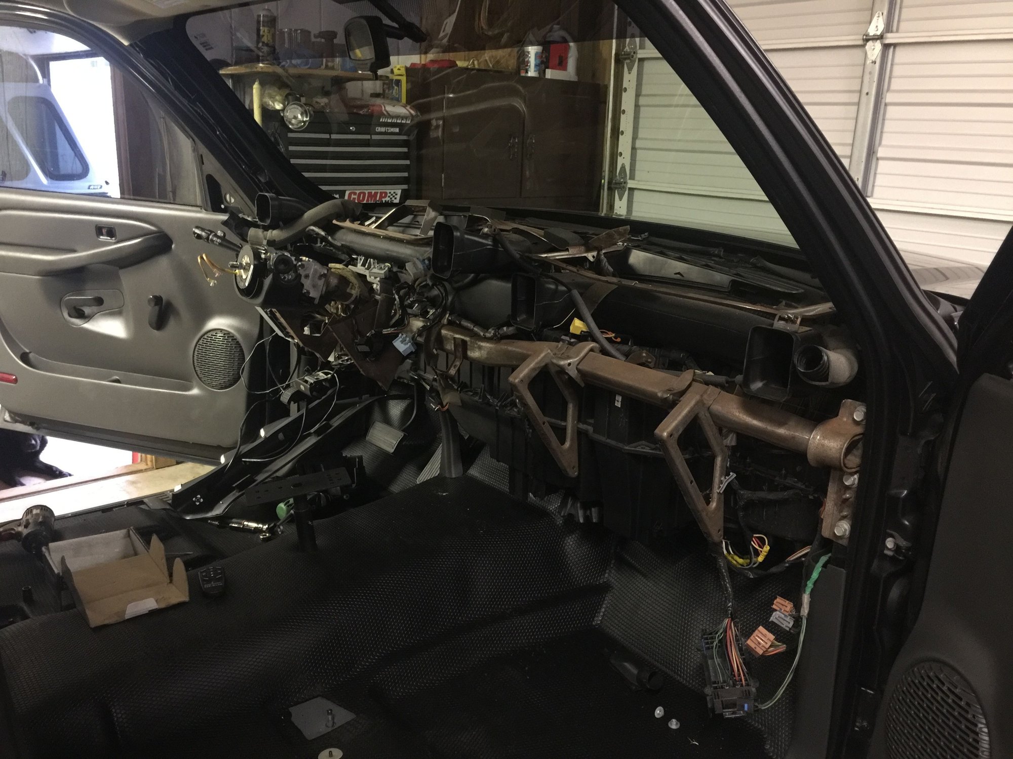 I did a thing today..... Went surprisingly well, this is the result of about 45 minutes worth of work. Talked with the chassis guy about having a cage an 4 link done this winter. Planning for an 8.50 cert and I figured I'm past the point of no return so I'm pulling out all of the HVAC ducting, blower motor, heater core, and and dash controls. Hopefully this will shed some considerable weight and simplify the dash removal when it become time to get the cage done. Unfortunately I had to go to work so this is all I could get done tonight, hopefully I'll be able to finish up tomorrow. Does anyone know of any companies that make a delete plate for the heat/ac controls.. if not I guess I'll just make one.