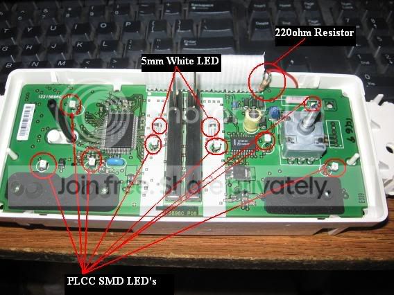 Hey, nice work on the AC, but I couldn't pick out where you put the resistors or where the actual led's were? Are the lights where all those little squares (6 + the 2 white LED's + 3 blue lights for the indicators)?