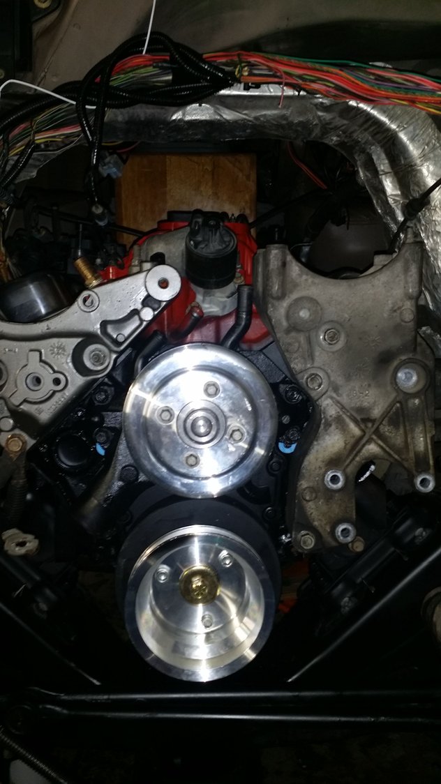 New genuine Sanden 4261 I had shipped to me from Sanden in Wylie, TX which is a SD7H15 variant at 9.5 CID per revolution with a 4.41" pulley. With the 6" crank pulley it turns 1.36x crank speed and has a maximum speed rating of 8,000 rpm and a maximum continuous rpm rating of 6,000. I have the PCM set to shut it off at 5,200 rpm or WOT. The March underdrive pulleys when I test fitted the compressor bracket that I had to grind down to clear the taller aluminum valve covers. I painted that bracket with Duplicolor cast-iron to match the alternator bracket.