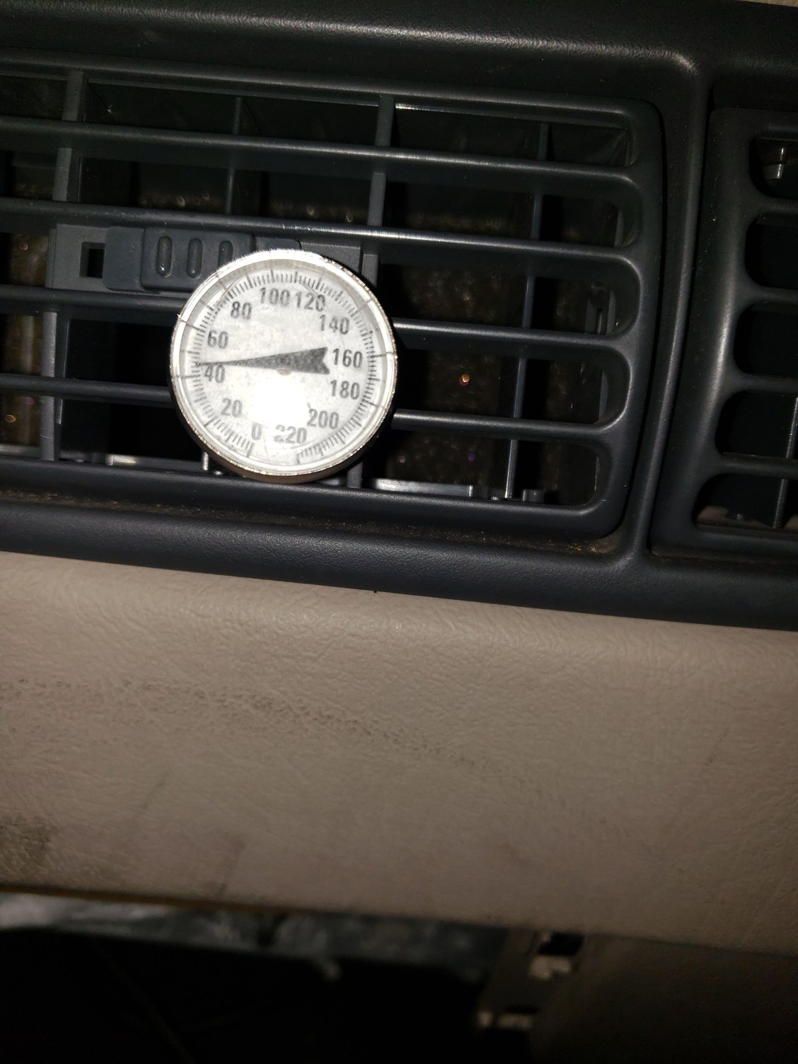 16" Flexalite 3,000 cfm puller installed behind the radiator with custom mounting brackets. Swapped the 2006 5.4 Ford fan blade out for the cut-down LBZ Duramax blade. Its on a severe duty Hayden clutch for a 2007 TBSS. It looks extra tight but it has over 1.5" of clearence. Left vent after idling for 10 minutes with the puller fan activated with HP Tuners. Still need to program parameters to make it come on as an auxiliary as well as stay on for a few minutes after the engine shuts down. I was reassembling the dash after putting the cluster back in. I replaced burned out bulbs in the cluster with red LEDs that are both brighter than the OEM bulbs and do not mess with your night vision as you scan the gauges. After 10 minutes idling with the 16" puller activated. This is the center vent, 10 minutes after shutting off the 16" puller fan. Still colder than the R134a stock system ever though about being. I think it ran about 56°F at idle in this heat when it was NEW! AC Pressures after idling 10 minutes with the electric puller fan off. This is the Sanden SD7H15 performance chart. At my ~2,100 rpm cruising speed with the 1.36:1 overdrive will be turning ~2,850 rpm and delivering more than 2x the BTU output. Going off memory, I think the lowest I have been able to adjust the cycling switch before the evaporator freezes is around 29°F out the vents. At 38°F at idle, have no doubt it will be in the low 30s going down the road.