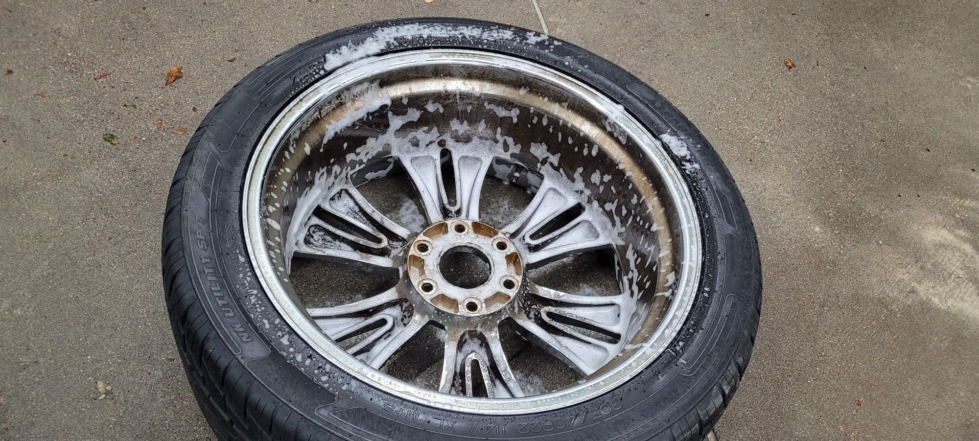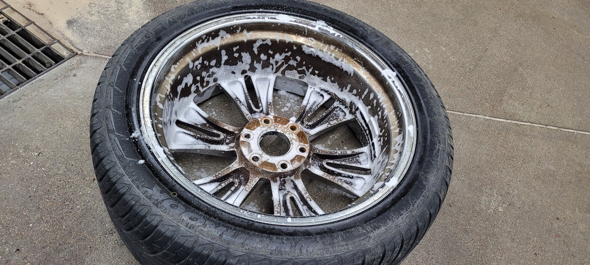 Cleaning up nicely. Used some Meguiars Hot Wheels chrome wheel cleaner and SOS pads on the back side. Soaked them with the Meguiars, let sit for a few minutes, and moistened the SOS pads with the wheel cleaner, as well as used it as a lubricant and rinse. Pressure washed with soap and the coin op engine cleaner, rinsed with "spot free rinse" and repeated the process.