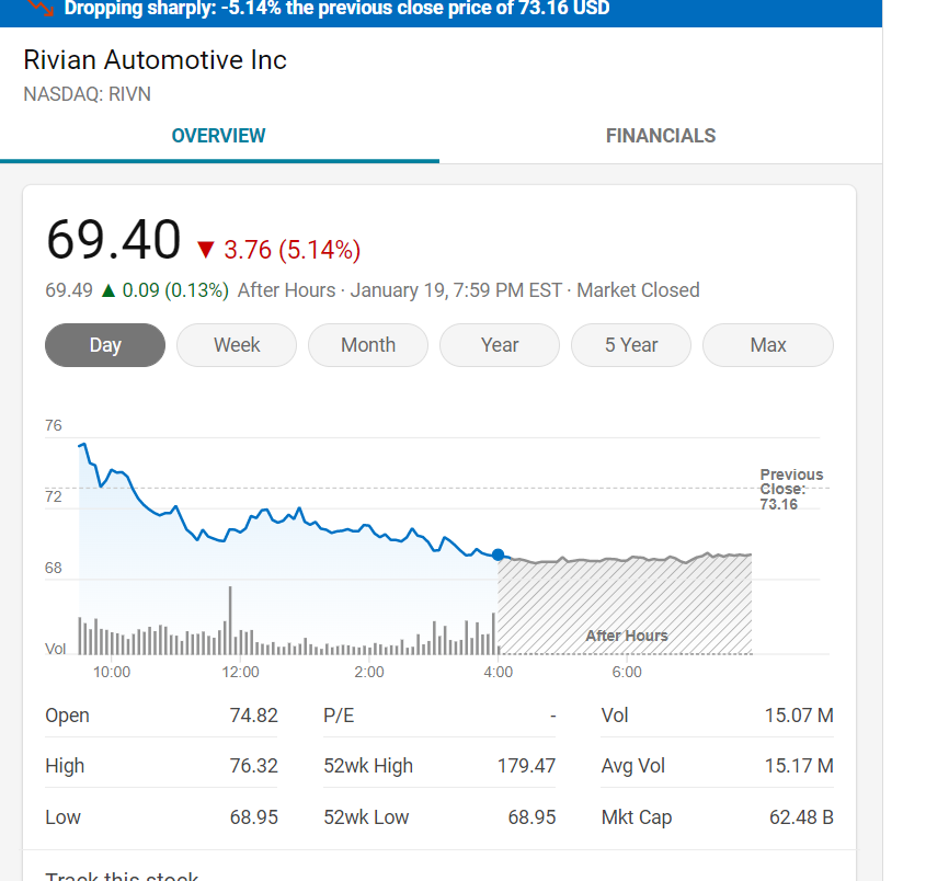 So the market in general is way down right now. Just about everywhere, everything is down. Rivian is currently at its lowest and currently 11% below its IPO. I think its going to drop a little more over the coming weeks, but then we're going to have an upturn in the next month or two.