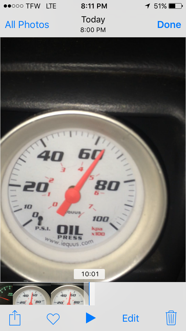 Ok so I'm out driving heading to do some test hits and the whole way (6 miles or so) my oil pressure is 50+ psi...I get to my destination bust off a few hits and my oil pressure goes to crap, first pass 30, second pass 20-10...so as I head back after seeing this it drops to 5psi to 0. I let off the throttle it goes back to 5-10...engine is not ticking or tapping or any abnormal noise...this is a mechanical gauge..and if I shut it down for 5 minutes then start it back up I have 50-60psi on the gauge.
